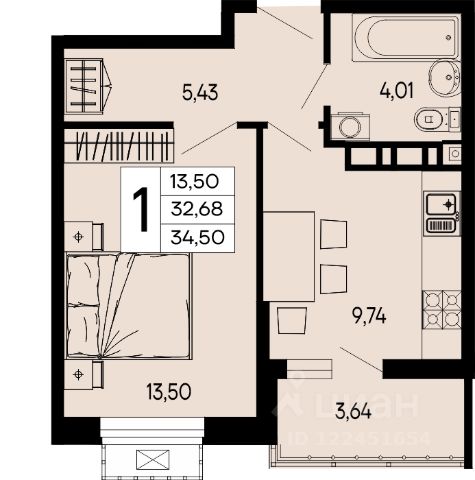 Продаётся 1-комнатная квартира в строящемся доме (Литер 3), срок сдачи: II-кв. 2027, общей площадью 38.75 кв.м., на 10 этаже.