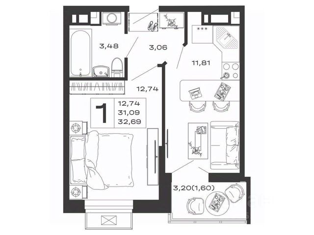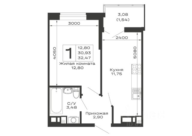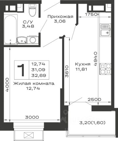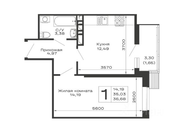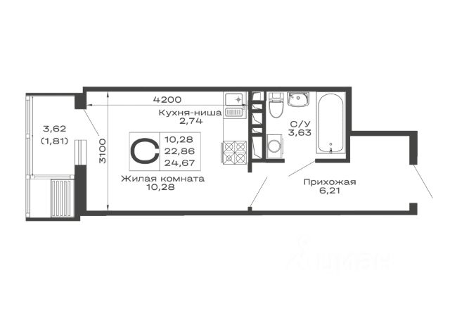 • Санузел под ключ: ванна с декоративным экраном, удобная раковина с пьедесталом, смесители, полотенцесушитель. На полу керамогранит.