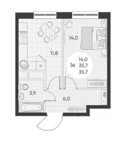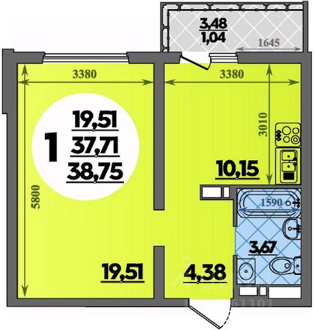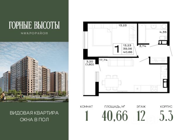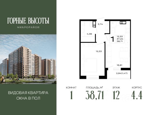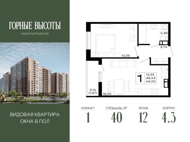 Продаётся 1-комнатная квартира в строящемся доме (Литер 8), срок сдачи: IV-кв. 2026, общей площадью 38.75 кв.м., на 12 этаже.