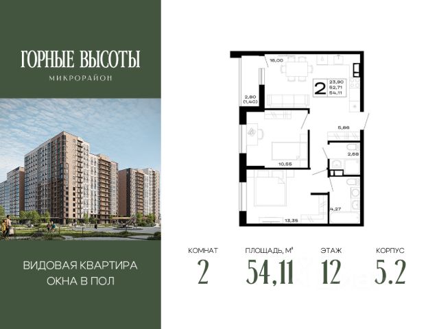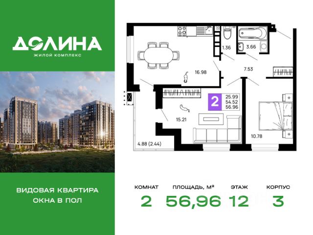 Продаётся 2-комнатная квартира в строящемся доме (Литер 3), срок сдачи: II-кв. 2027, общей площадью 65.53 кв.м., на 12 этаже.