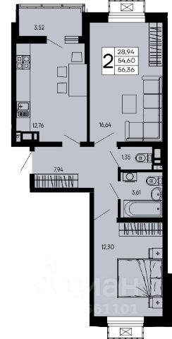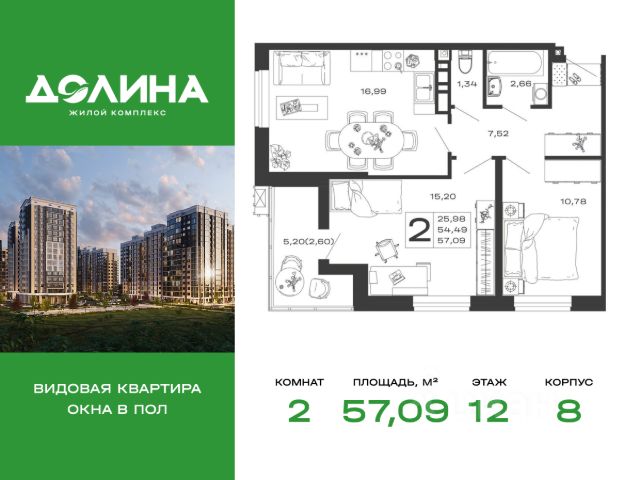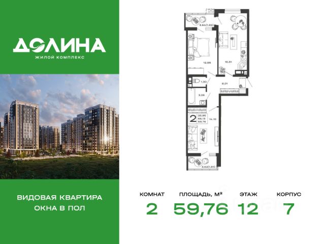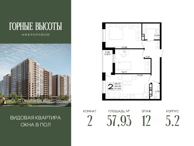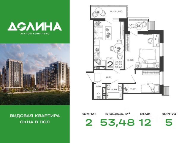 Продаётся 2-комнатная квартира в строящемся доме (Литер 3), срок сдачи: II-кв. 2027, общей площадью 65.53 кв.м., на 12 этаже.