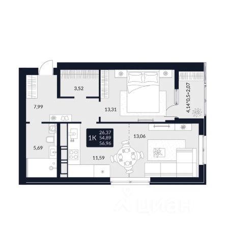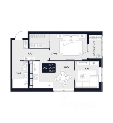 • Санузел под ключ: ванна с декоративным экраном, удобная раковина с пьедесталом, смесители, полотенцесушитель. На полу керамогранит.