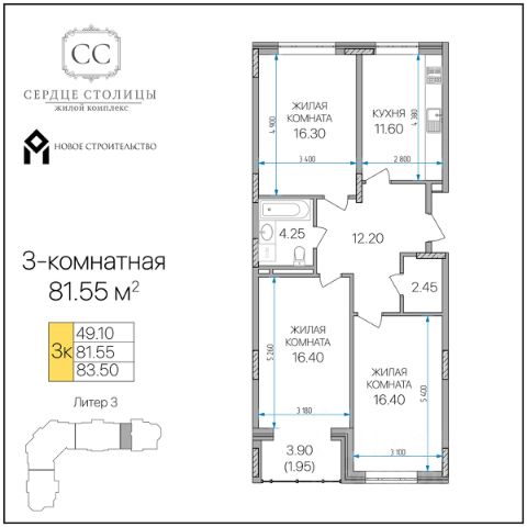 Жилой комплекс состоит из 2 кирпично-монолитных корпусов высотой 16 этажей. Фасады облицованы кирпичом, в подъездах выполнена дизайнерская отделка. На первом этаже предусмотрены помещения для хранения колясок. В каждом корпусе установлены пассажирские и грузовые лифты. В проекте представлены квартиры с 13 комнатами, с панорамными окнами и потолками высотой 2,65 метра. Жилье передается без отделки, в черновом варианте: выполнены базовые строительные работы, включая возведение стен. На стилобатной части комплекса обустроены озелененные дворы, детские и спортивные площадки. Территория организована по концепции без машин. Предусмотрены крытый паркинг на 100 мест и открытая парковка, а также освещенные тротуары. Безопасность обеспечивается видеонаблюдением и контролем доступа на территорию. Для дополнительного комфорта жильцов доступен сервис консьержа и система умного дома. Комплекс расположен в поселке Яблоновский Республики Адыгея. В 5 минутах пешком находится остановка общественного транспорта Космическая улица. В радиусе 515 минут находятся школы, детские сады, кафе, магазины, аптеки, салоны красоты и пункты выдачи. До центра Краснодара, где находятся театры, музеи и культурные достопримечательности, можно добраться за 20 минут транспортом. Продам 3-комнатную квартиру 80 м2 (квадратных метров) в республике Адыгея.
