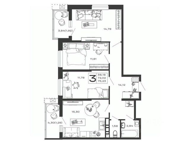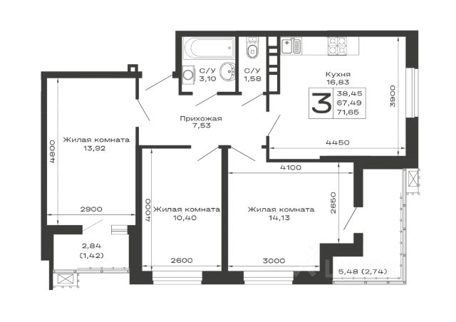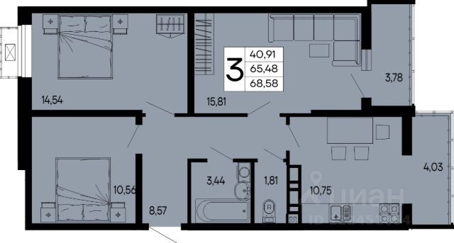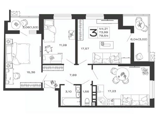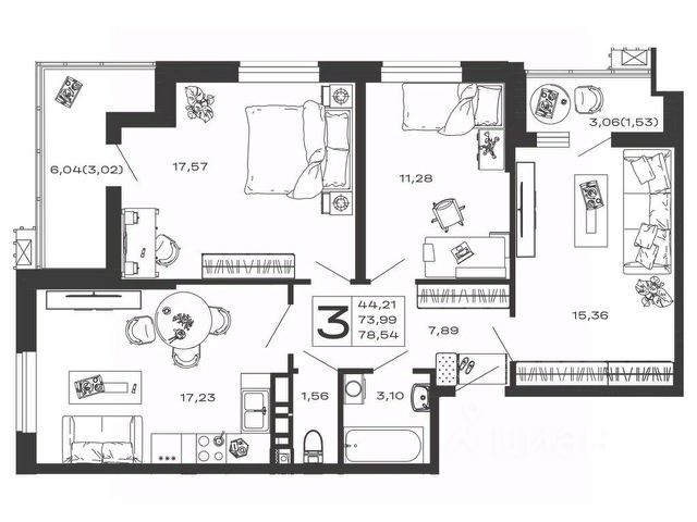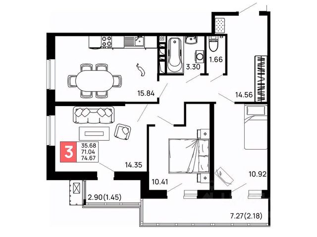 Продаётся 3-комнатная квартира в строящемся доме (Литер 3), срок сдачи: II-кв. 2027, общей площадью 85.28 кв.м., на 7 этаже.