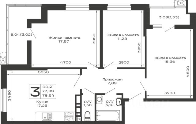 Продаётся 3-комнатная квартира в строящемся доме (Литер 4), срок сдачи: II-кв. 2027, общей площадью 80.68 кв.м., на 8 этаже.