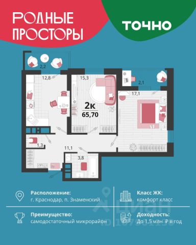Продаётся 2-комнатная квартира в строящемся доме (Литер 12), срок сдачи: IV-кв. 2025, общей площадью 61.4 кв.м., на 11 этаже. "Родные просторы"- самодостаточный микрорайон, который реализован по принципу комплексного развития территории, где есть вся инфраструктура для комфортной жизни. На территории 41 га 29 домов от 9 до 24 этажей, уютные дворы со спортивными и игровыми площадками, социальные и коммерческие объекты, зеленые массивы и фонтаны. Главная точка притяжения "Родных просторов" - парк семейного отдыха площадью 9 га, 4,5 км прогулочных аллей, амфитеатр для мероприятий, кинофестивальная площадка. Особая гордость микрорайона современная школа на 1550 мест и 3 детских сада "Ладушки", "Веснушки" и "Топотушки" на 880 малышей. В центре микрорайона строятся фитнес-клуб BALANCE с акватермальным комплексом и собственная поликлиника, площадью более 5000 кв.м. Уже открыт православный храм Святых Первоверховных апостолов Петра и Павла.