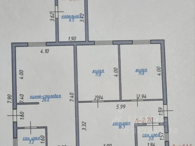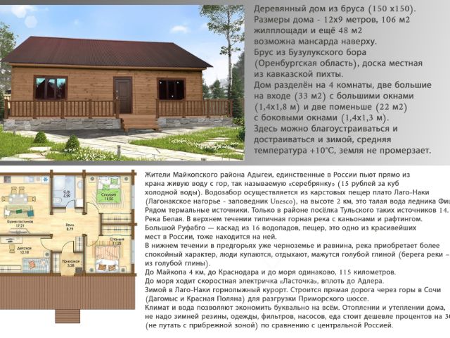 Продаётся деревянный дом из бруса (150 х150). Размеры дома - 12х9 метров, 106 м2 жилплощади и ещё 48 м2 возможна мансарда наверху. Брус из Бузулукского бора (Оренбургская область), доска местная из кавказской пихты. Дом разделён на 4 комнаты, две большие на входе (33 м2) с панорамными окнами (1,4х1,8 м) и две поменьше (21 м2) с боковыми окнами (1,4х1,3 м).