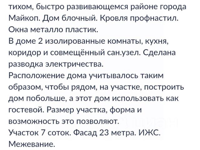 Арт. 118753513 Уникальное предложение в ауле Хакуринохабль Представляем вашему вниманию редкую возможность стать владельцем двух домов на одном участке на 25 сотках. Здесь царит атмосфера умиротворенности и единение с природой, которую сложно найти даже за пределами крупных городов. Основные характеристики недвижимости: - Два жилых дома общей площадью 140 квадратных метров. - Просторные комнаты, удобные планировки. - Наличие всех необходимых коммуникаций для комфортного проживания. - Большой земельный участок позволяет обустроить сад, зону отдыха или дополнительные постройки. Этот объект идеально подойдет для тех, кто ценит спокойствие и красоту природы, стремясь создать собственный уголок гармонии и уюта. Отличный выбор для постоянного проживания. Позвоните нам, чтобы ознакомиться с подробностями и организовать просмотр. Ваша новая жизнь начинается именно здесь! Спешите сделать выгодное приобретение своего будущего жилья!