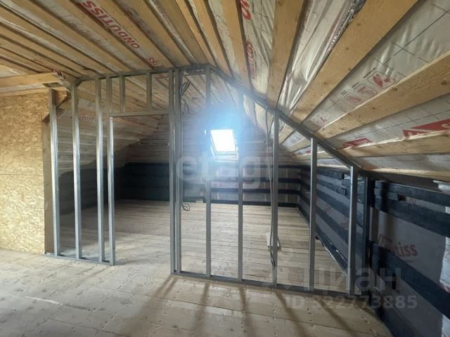 Крыша дома из трехслойной мягкой кровли (зубы дракона) черного цвета (гарантия от производителя 25 лет) с утеплением минеральной ватой покатов и пола второго этажа 150 мм. На крыше три вентиляционных выхода (грибка) над каждым помещением и мансардное окно фирмы FАКRО (78 см на 118 см) и шикарное витражное окно. На мансарде дома черновые полы и покаты изнутри обиты пароизоляционной пленкой (для жилых помещений) с обшивкой досками под будущее крепление гипсокартонна. По периметру дома свес кровли шириной 1 м и подшит софитами с перфорацией под Евробрус. По периметру участка имеется бетонный забор (2,3 м высотой), а вдоль заезда через откатные ворота забетонированы толстостенные металлические трубы 100D для будущего навеса.