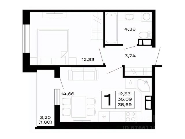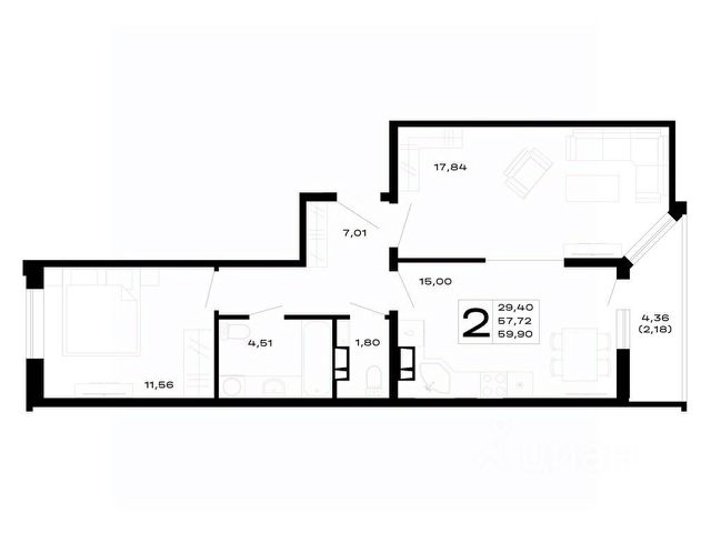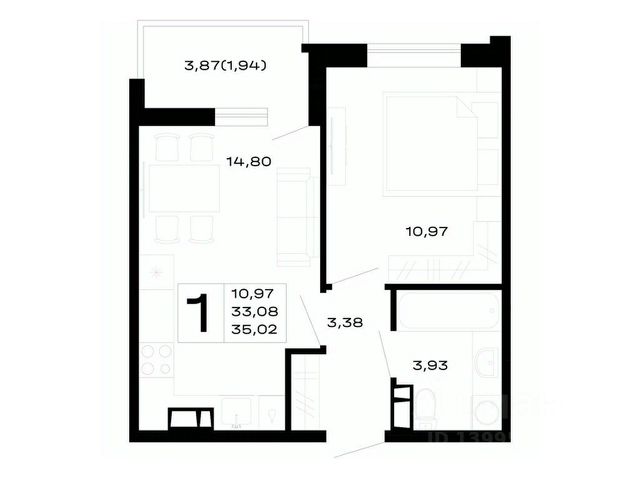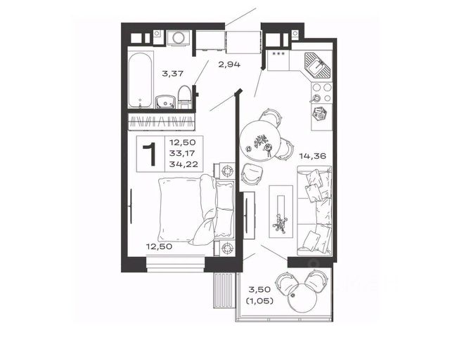 - кухня-гостиная 15,74 кв.м - пространство, где легко разместится и рабочая зона кухни, и зона отдыха.