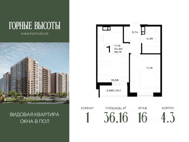 Литер 4.3, 16 этаж, 266. "ГОРНЫЕ ВЫСОТЫ" - это новый современный микрорайон на 20 га, сочетающий в себе комфорт современного города и красоту первозданной природы. Здесь cepдце остаётcя нaвсегда: соседи станoвятся семьёй, технoлoгии служат уюту, а горный вoздуx и панopaмныe виды дaрят oщущение гаpмонии каждый дeнь. Благоустройство всего микрорайона Вся необходимая инфраструктура в пешей доступности Продуманное содержание Все для детей всех возрастов Собственный детский сад на 250 мест Свой медицинский центр на территории Физкультурно - оздоровительный комплекс Торговые галереи на первых этажах Просторные дворы Скверы и бульвар с фонтаном Воркаут-зоны Безопасность и конфиденциальность Безбарьерная среда Дизайнерские лифтовые холлы Быстрые бесшумные лифты Наземный и подземный паркинг на 4545 машиномест Витражное остекление в каждой квартире Великолепные виды на горы, лес и городской пейзаж Приобрести квартиру можно одним из способов: -субсидированная семейная ипотека от 3,5 % на весь срок -рассрочка -оплата наличными -дистанционная покупка Позвоните сейчас и забронируйте квартиру со скидкой! Наслаждайтесь каждым днем в атмосфере гармонии и уюта!