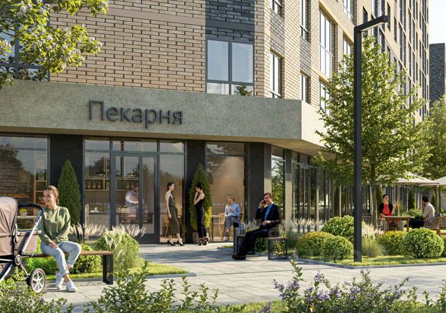 Уютный двор с дизайнерским озеленением, рулонные газоны, клумбы с автополивом, современные детские и спортивные площадки с безопасным покрытием и много свободного пространства благодаря широкой посадке домов.