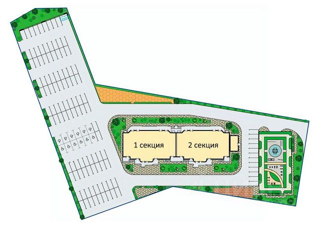 Уютный двор с дизайнерским озеленением, рулонные газоны, клумбы с автополивом, современные детские и спортивные площадки с безопасным покрытием и много свободного пространства благодаря широкой посадке домов.