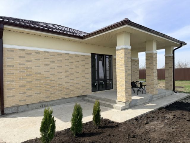 В ПРОДАЖЕ! Новый коттедж в микрорайоне Новая Адыгея ауле Старобжегокай. Отличный район для загородной жизни, подъездные пути — асфальтированные дороги. В шаговой доступности — школа, детский сад, магазины. До центра Краснодара — 15 минут на автомобиле. Дом расположен на территории нового коттеджного квартала, все дома возведены в едином архитектурном стиле. Хорошие подъездные пути, территория комплекса благоустроена. Одноэтажный коттедж возведен в современном архитектурном стиле по индивидуальному проекту с использованием качественных строительных материалов. Внутренние стены — блок, наружные — лицевой керамический кирпич, большие металлопластиковые окна с декоративной раскладкой, кровля — металлочерепица, дизайнерские двери. Дом общей площадью 100 кв.м спланирован в крытое крыльцо, прихожую, холл, раздельный санузел, две изолированные комнаты, кухню-гостиную, в которой можно выделить еще комнату, крытую террасу. Терраса благоустроена, возведена готовая мангальная зона. Коммуникации: центральное водоснабжение, электроэнергия 15 кВт, 3 фазы, канализация — септик 12 м3, газ — по меже. Дом расположен на 6 сотках земли, назначения ИЖС. Участок огорожен по периметру забором, с фасадной стороны — кирпичные колонны, кованый забор, ворота, калитка, двор благоустроен, паркоместа для автомобилей. В доме выполнена предчистовая отделка: стяжка пола, штукатурка стен, разводка электрического, сантехнического и отопительного оборудования, двухконтурный газовый котел, современные радиаторы отопления. Дом готов. Льготная ипотека.