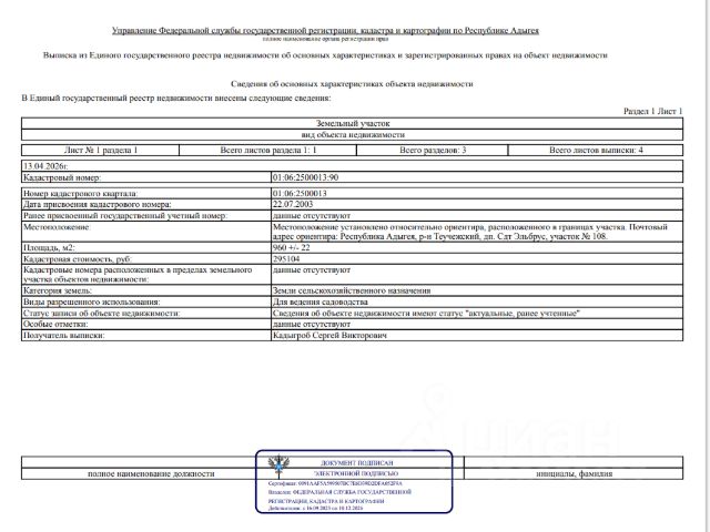 Продается земельный участок с кадастровым номером 01:06:2500012:960, В дачном поселке Четук, участок 3-ий от реки (2 минуты) и 3- ий от дороги. Номер участка 1002 Участок расположен между базой ФК Краснодар и строящемся сафари парком. т.е. перспективный. Без обременений Все вопросы по телефону. Topr