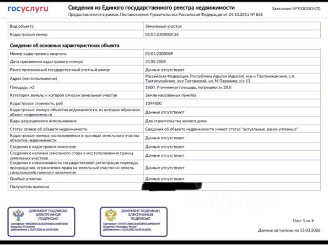 Продам земельный участок ИЖС квадратной формы, собственность зарегистрирована Росреестром, полностью размежеван с точным определением границ респ. Адыгея, 15 км к югу от г.Краснодар, длиной фасадной части 30 метров. Разрешение на строительство имеется. Дорога к участку асфальтированная, улица жилая, недалеко Школа, Садик, Поликлиника, Администрация, Пенсионный фонд, Нотариус, пункты выдачи Вайлдберриз, Озон, Яндекс Маркет, магазины Пятерочка, Красное-Белое, Магнит, МФЦ, Сбербанк, Почта России, ГАИ, СТО, несколько Автозаправок и Автомоек. Коммуникации: электроэнергия с пропускной мощностью 3 фазы 10 к/ватт и центральный водопровод подключены. Газовая труба проходит вдоль участка по меже, тех.условия с возможностью подключения на руках, большой переливной двухкамерный монолитный септик не требующий дальнейшего обслуживания, ворота откатные по середине шириной въезда 5 метров. По краям участка склад и дачный домик с полноценными коммуникациями внутри для круглогодичного посещения, много фруктовых насаждений. Документы на землю, электричество, воду, подходит под сельскую ипотеку и мат.капитал, ограничений, обременений на участок нет. Расположен вдали от шумных дорог, промышленных предприятий, идеальное место для дома, коттеджа, рядом активно строятся и постоянно живут занятые индивидуальным делом соседи. Продажа от собственника без посредников. Успей приобрести, стоимостью автомобиля среднего класса, для себя земельный участок и построй по твоему проекту дом мечты, воплоти свои желания, возможности, в южном, безопасном, экологически чистом, с одновременным присутствием полной цивилизации, яркого солнца, звёзд, чистого синего неба над головой, неимоверно окружающим красотой природы вокруг, регионе России.