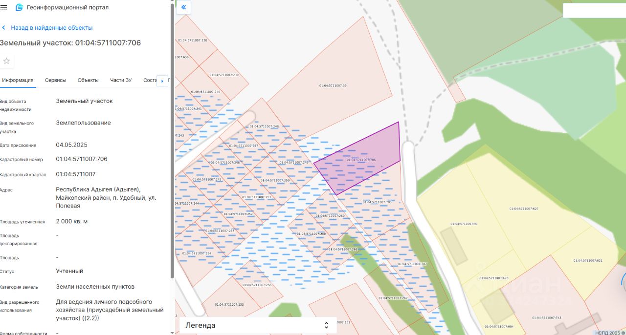 земельный участок с кадастровым номером 01:04:5711007:706, площадью 2000 кв. м., категории земель "Земли населенных пунктов", расположенного по адресу (местоположение): Республика Адыгея (Адыгея), Майкопский район, п. Удобный, ул. Полевая, с видом разрешенного использования "Для ведения личного подсобного хозяйства (приусадебный земельный участок) ((2.2))"