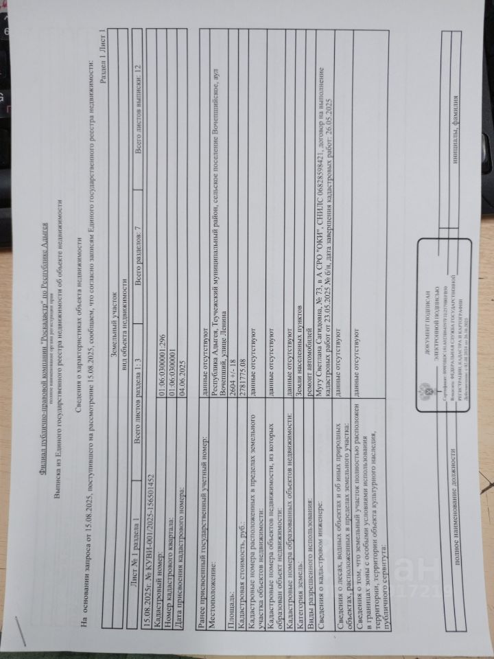 Право на заключение договора аренды земельного участка категории "земли населенных пунктов" с кадастровым номером 01:06:0300001:296, площадь: 2604 кв. м., расположенного по адресу: Российская Федерация, Республика Адыгея, Теучежский муниципальный район, Вочепшийское сельское поселение, аул Вочепший, ул.Ленина, с видом разрешенного использования: ремонт автомобилей, сроком на 30 месяцев (2 года 6 месяцев).