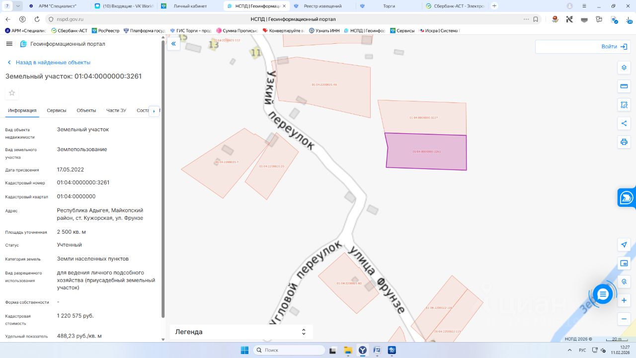земельный участок с кадастровым номером 01:04:0000000:3261, площадью 2500 кв. м., категории земель "Земли населенных пунктов", расположенного по адресу (местоположение): Республика Адыгея, Майкопский район, ст. Кужорская, ул. Фрунзе, с видом разрешенного использования "для ведения личного подсобного хозяйства (приусадебный земельный участок)"