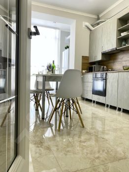 Особенность квартиры в ее панорамных окнах с видом на город, высокий потолок так же добавляет воздуха и пространства, создавая ощущение тишины и спокойствия.