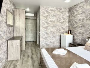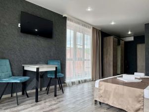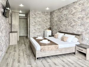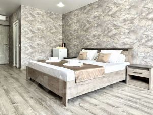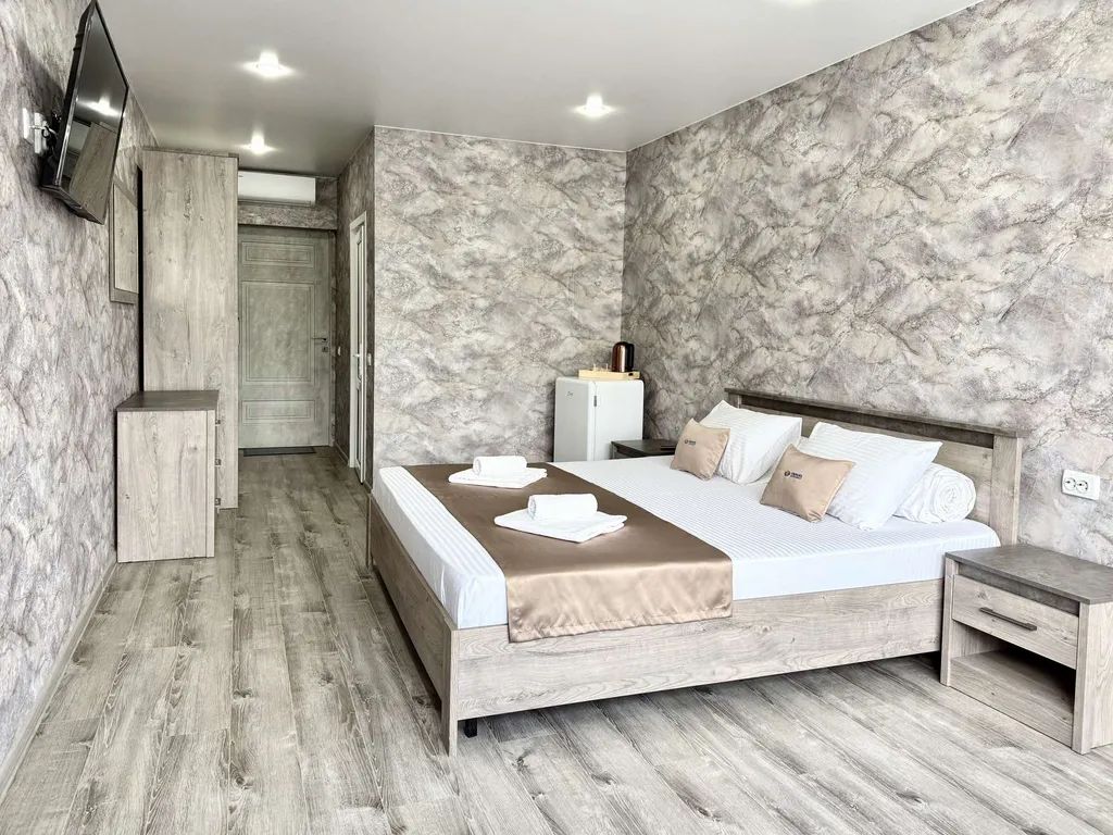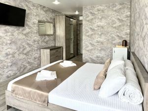 — Просторная двуспальная кровать — Собственная ванная комната с душем, феном и бесплатными косметическими принадлежностями — Телевизор, холодильник, сплит-система, чайник, стол, стулья, прикроватные тумбочки, шкаф — Ламинат, современный интерьер, панорамные окна в пол