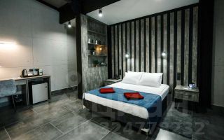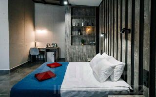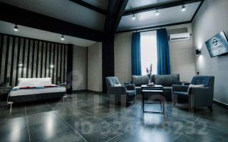 Просторный номер в современном стиле с высокими потолками с зоной отдыха в серо-синей цветовой гамме.