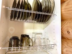 - оборудованная кухонная зона: электрочайник, мини-холодильник, индукционная плита, посуда и кухонные принадлежности