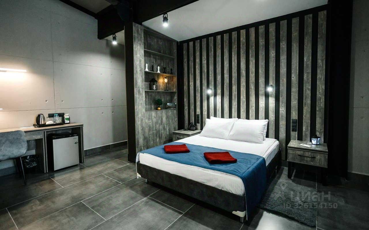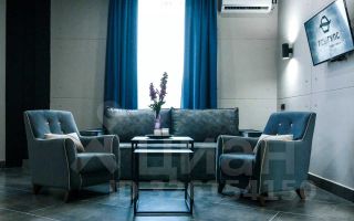 Просторный номер в современном стиле с высокими потолками с зоной отдыха в серо-синей цветовой гамме.
