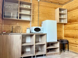 - Уютная кухня с микроволновой печью, чайником и мини-холодильником,