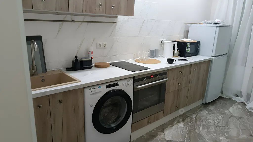 Кондиционер (сплит-система), стиральная машина, холодильник, варочная панель, микроволновая печь, чайник, фен.