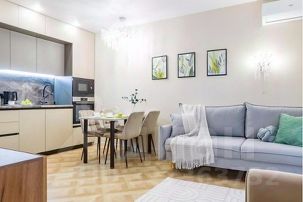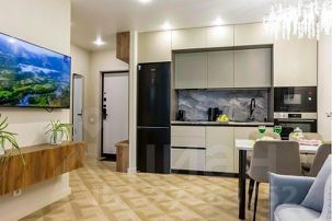 - Полностью оборудованная встроенная кухня: индукционная плита, духовка, микроволновка, посудомойка, капсульная кофемашина, чайник, фильтр воды