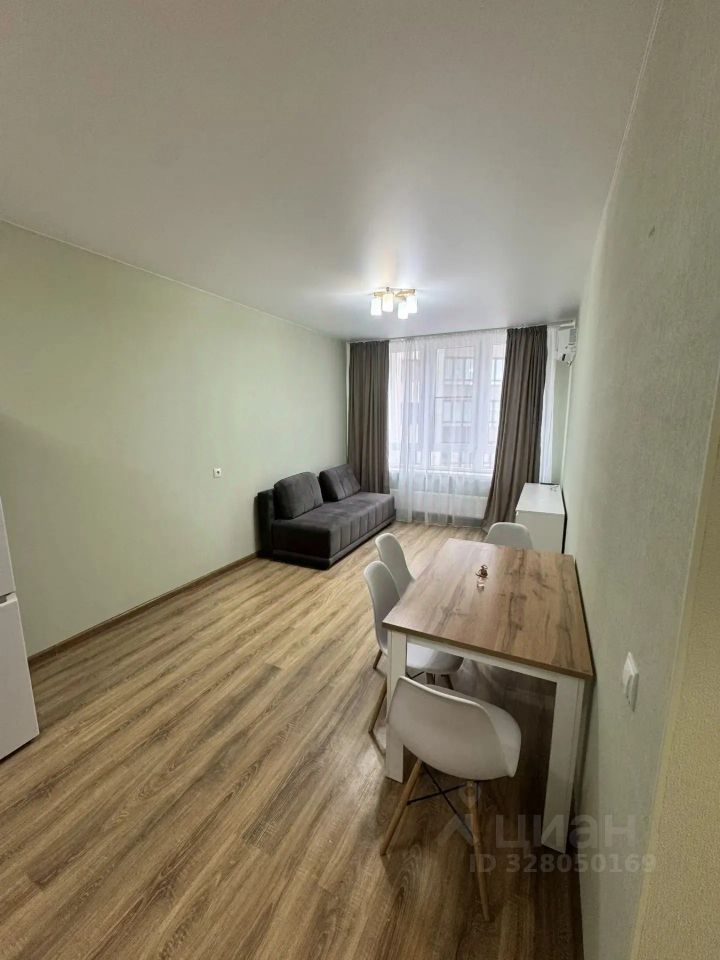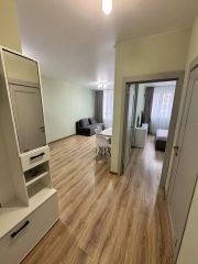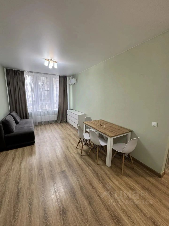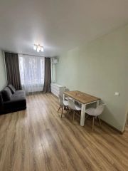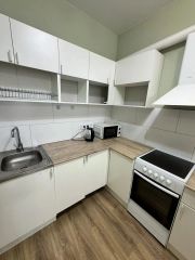 Квартира 43,4 квадрата, без балкона. Кухня-гостиная 21 кв с высоким большим окном, кухонный гарнитур, бытовая техника (холодильник, стиральная машина, электрическая плита, микроволновая печь, чайник, сплит-система 9ка), обеденная зона, удобный раскладной диван спальное место 140*200, комод для хранения вещей.