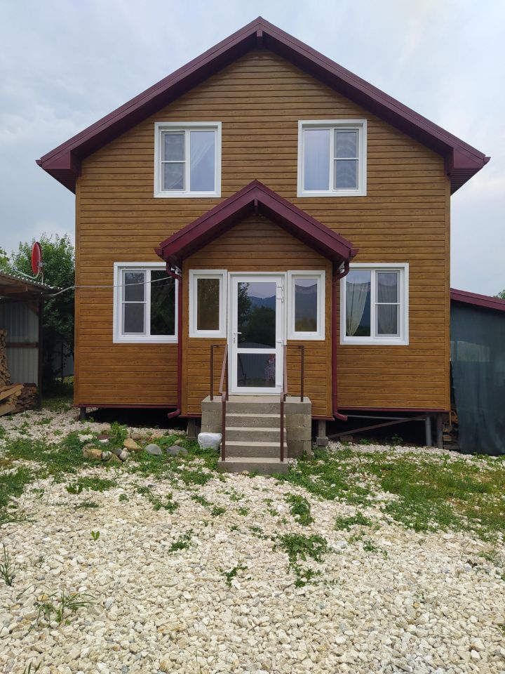 Эко-Дача -двухэтажный дом в деревенском стиле с печью-камином, дизайнерской обстановкой, полностью оборудованной кухней, двумя санузлами, большим балконом, верандой, мангальной зоной, красивым видом на участке 5 соток, территория огорожена, без соседей. Лес начинается в 50метрах, рядом река, основные достопримечательности: канатная дорога, плато Лаго-Наки, монастырь, заповедник, водопады, пещеры, экстрим-парк, По договоренности домашние завтраки из деревенских продуктов. Дом новый, только построен. Есть большой каркасный бассейн и батут.