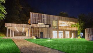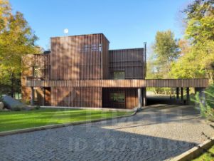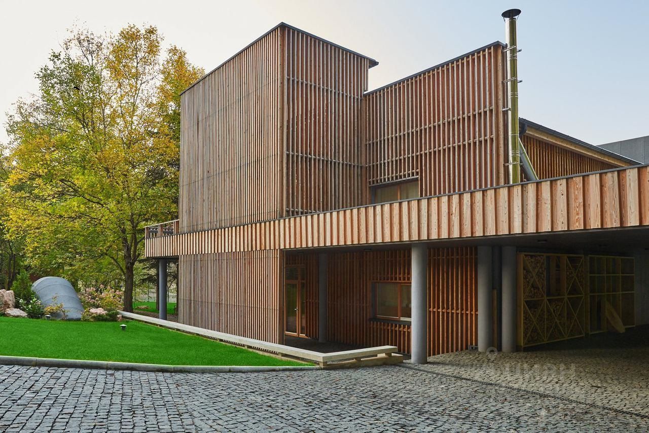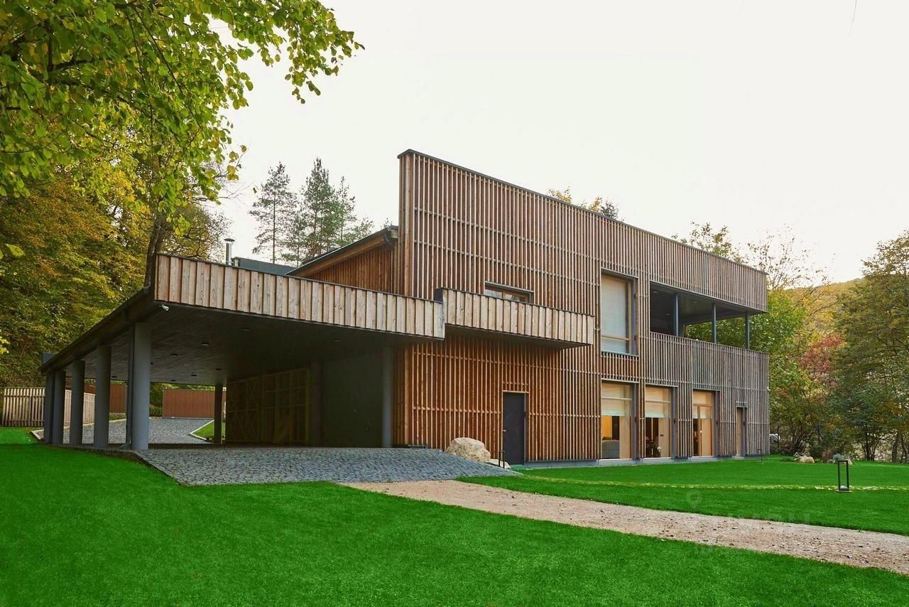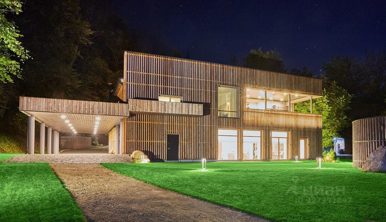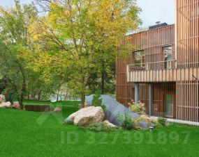 На участке, покрытом рулонным газоном Premium, растут деревья и кустарники. Имеются зоны уличного очага, винный погреб и декоративные природные композиции из камня и растений, крытый навес на 4 авто.