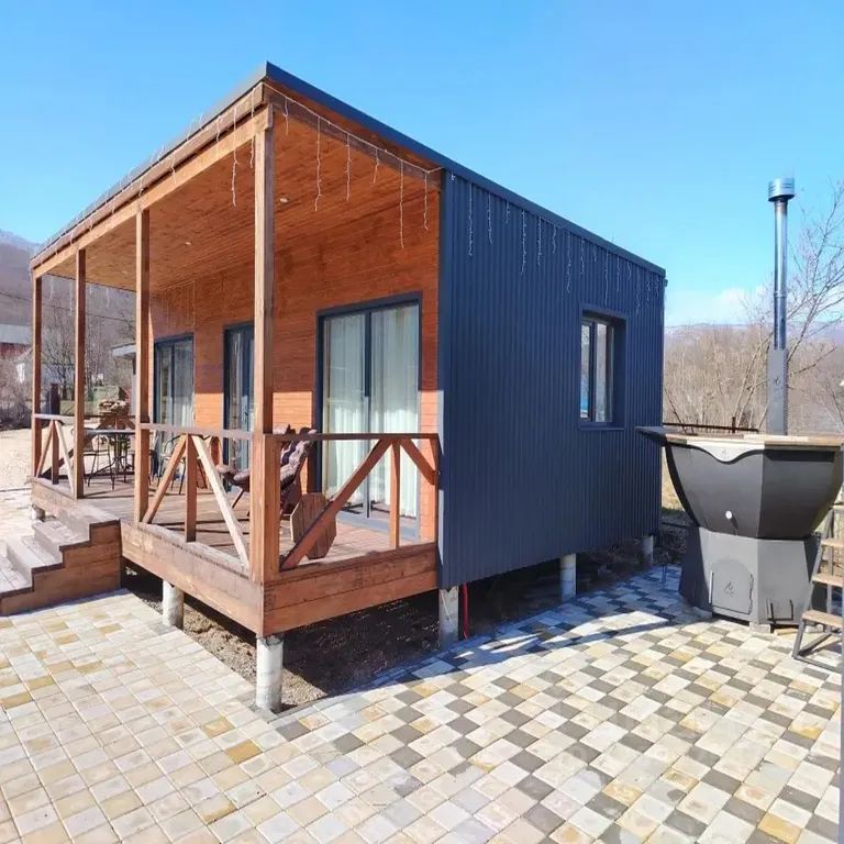- Главные бонусы комплекса: выходя из дома, вы попадаете в зону отдыха с двумя чанами с подогревом (круглый год) и баней на дровах — это лучший способ расслабиться после насыщенного дня.