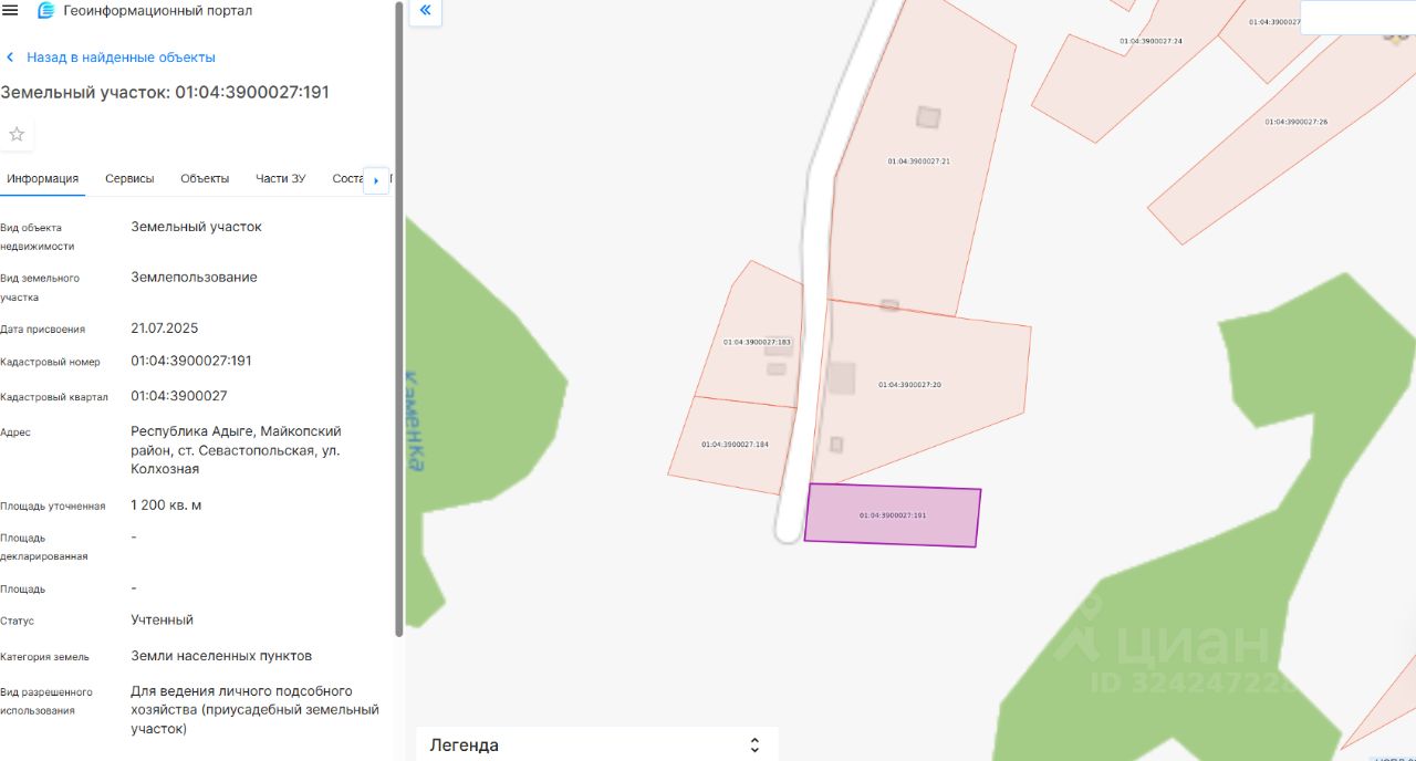 Земельный участок с кадастровым номером 01:04:3900027:191, площадью 1200 кв. м., категории земель "земли населенных пунктов", расположенного по адресу (местоположение): Республика Адыгея, Майкопский район, ст. Севастопольская, ул. Колхозная, с видом разрешенного использования "Для ведения личного подсобного хозяйства (приусадебный земельный участок)"