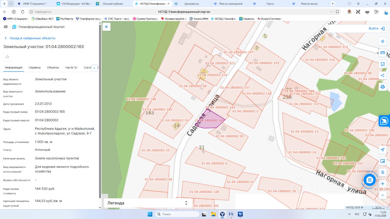 Земельный участок с кадастровым номером 01:04:2800002:165, площадью 1000 кв. м., категории земель "земли населенных пунктов", расположенного по адресу (местоположение): Местоположение установлено относительно ориентира, расположенного в границах участка. Почтовый адрес ориентира: Республика Адыгея, р-н Майкопский, с Новопрохладное, ул Садовая, 9-Г, с видом разрешенного использования "Для ведения личного подсобного хозяйства"