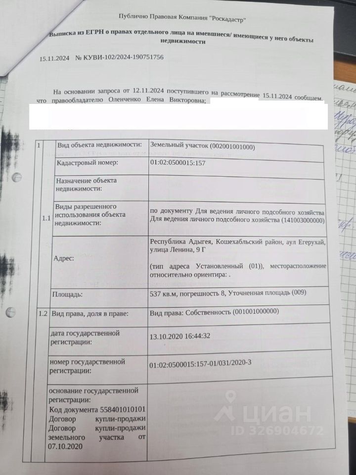 Д-к: Оленченко Е.В. Земельный участок (для ведения личного подсобного хозяйства), площадь 537 кв.м., кадастровый номер 01:02:0500015:157. Адрес: Республика Адыгея, Кошехабльский район, аул Егерухай, ул. Ленина, 9Г. Начальная цена 290 572,50 руб., задаток 43 586 руб., шаг аукциона 2 906 руб., ув. 1508