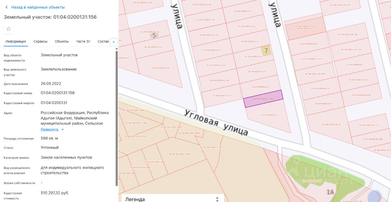 Земельный участок с кадастровым номером 01:04:0200131:156, площадью 598 кв. м., категории земель "земли населенных пунктов", расположенного по адресу (местоположение): Российская Федерация, Республика Адыгея (Адыгея), Майкопский муниципальный район, Сельское поселение Тульское, Тульский поселок, Гаражная улица, земельный участок 1Б