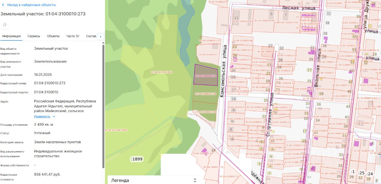 Земельный участок с кадастровым номером 01:04:3100010:273, площадью 2499 кв. м., категории земель "земли населенных пунктов", расположенного по адресу (местоположение): Российская Федерация, Республика Адыгея (Адыгея), муниципальный район Майкопский, сельское поселение Абадзехское, п. Первомайский, ул. Комсомольская, с видом разрешенного использования "Индивидуальное жилищное строительство"