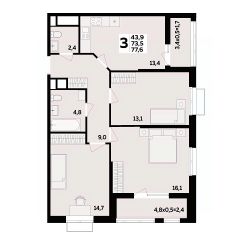 Продаётся 3-комнатная квартира в строящемся доме (Литер 1.3), срок сдачи: III-кв. 2026, общей площадью 77.6 кв.м., на 12 этаже. Жилой комплекс "MegaCity" от застройщика "ГК Дарстрой" по улице Бжедугская в ауле Новая Адыгея.