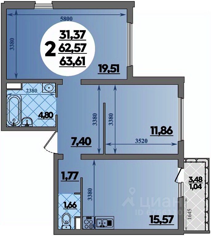• Санузел под ключ: ванна с декоративным экраном, удобная раковина с пьедесталом, смесители, полотенцесушитель. На полу керамогранит.