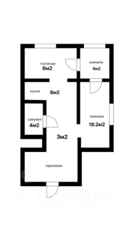45.2м2 общая площадь, 18.2м2 зал, 6м2 спальня, 6м2 гостиная, 8м2 кухня, 4м2 санузел, 3м2 прихожая