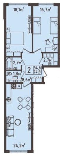 В спальне 18 м2 предусмотрено место под шкафкупе.