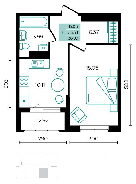Общая площадь36,99 м²