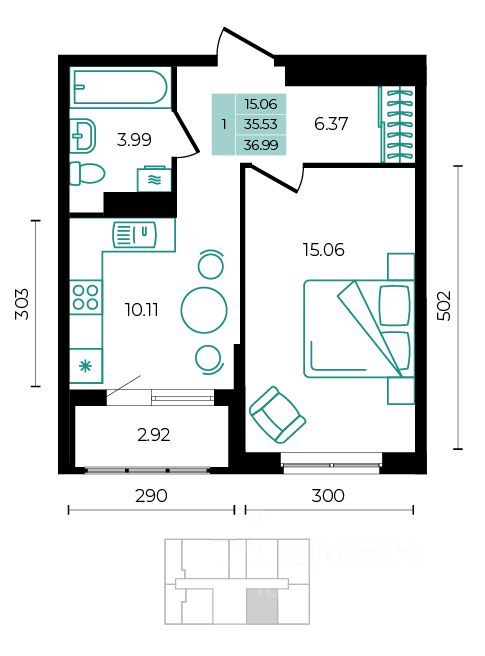 Общая площадь36,99 м²