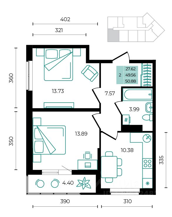 Общая площадь50,88 м²