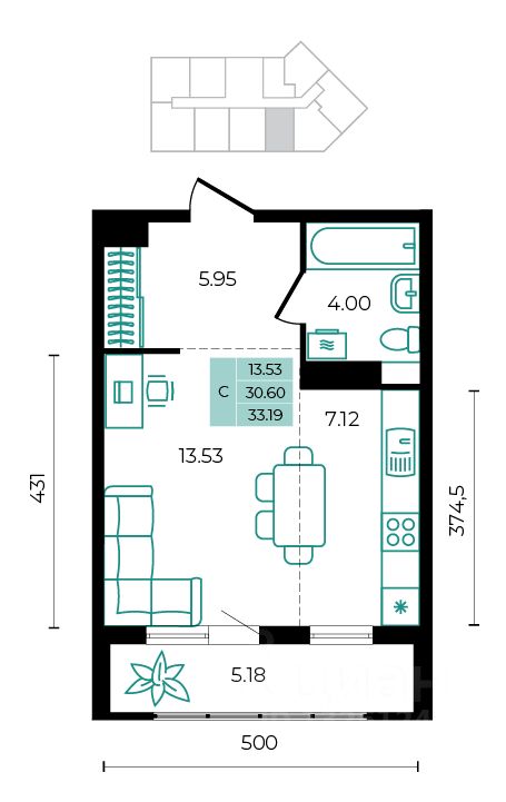 Общая площадь33,19 м²