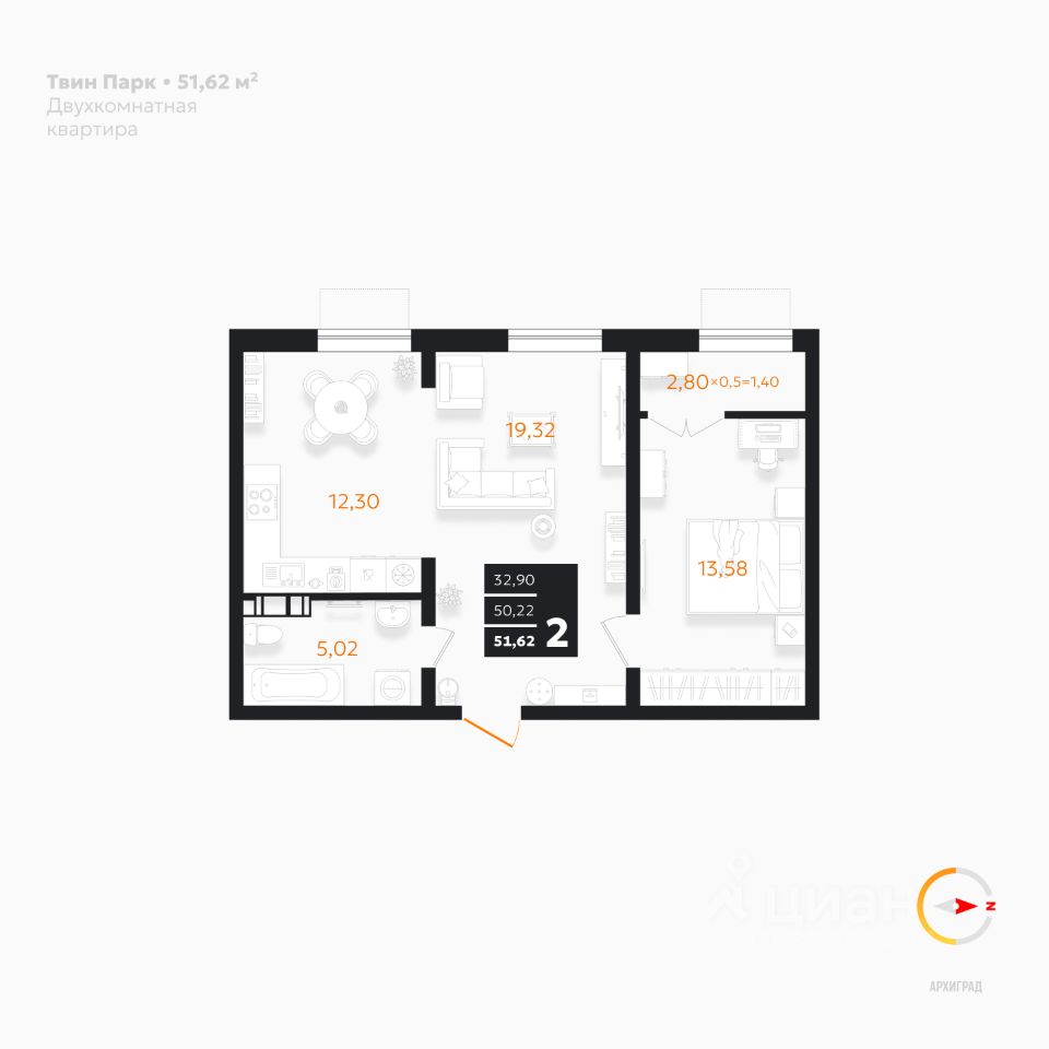Общая площадь51,62 м²