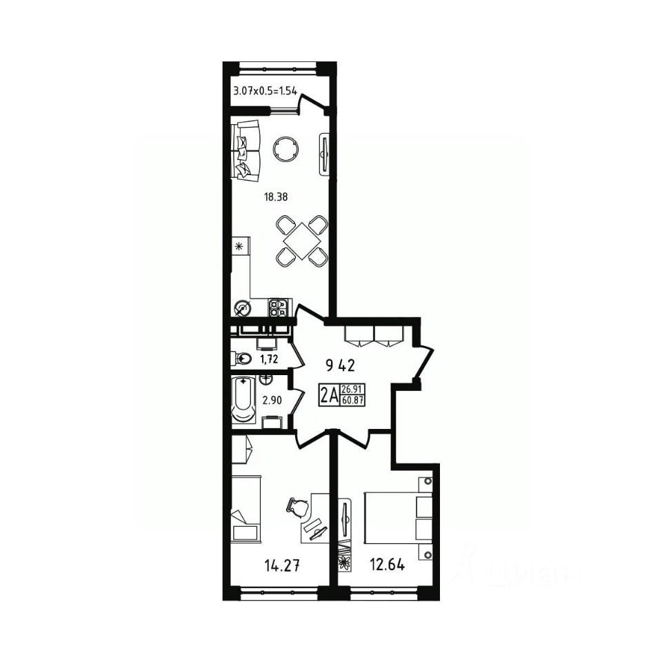60,87 м²